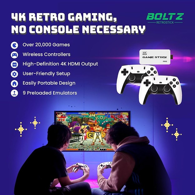 The Boltz Retro retro console comes with wireless controller, 4K, HDMI output, and a simple, easy set up process, which helps both novices and seasoned players to dive into classic games, which remain their favourite to this day. The Boltz Retro retro console has something for everybody and it promises to be the best addition to your gaming arsenal. Now let’s deep dive into understanding. What makes the Boltz Retro stick must have gaming gadget for all the gaming enthusiasts out there.