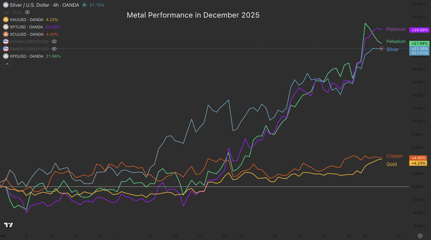 Now targeted by proxy trade buyers looking for value, Palladium has become the second-best performing metal in December.