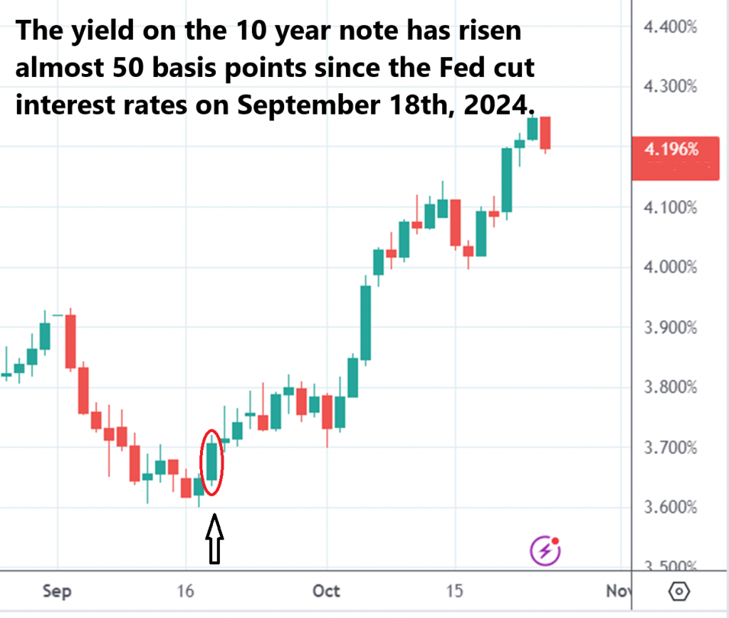 Let me share one chart which caught my attention which fits into the “kayfabe” category. On September 18, 2024, the Fed cut interest rates 50 basis points and claimed we had had a strong and resilient economy. Yet since that date the yield on 10-year Treasury Notes have actually increased 50 basis points. Spin it any way you want, the Treasury market is not buying the Fed’s actions.