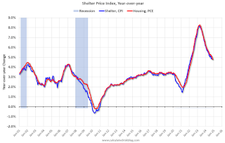 Here is a graph of the year-over-year change in shelter from the CPI report and housing from the PCE report this morning, both through November 2024.