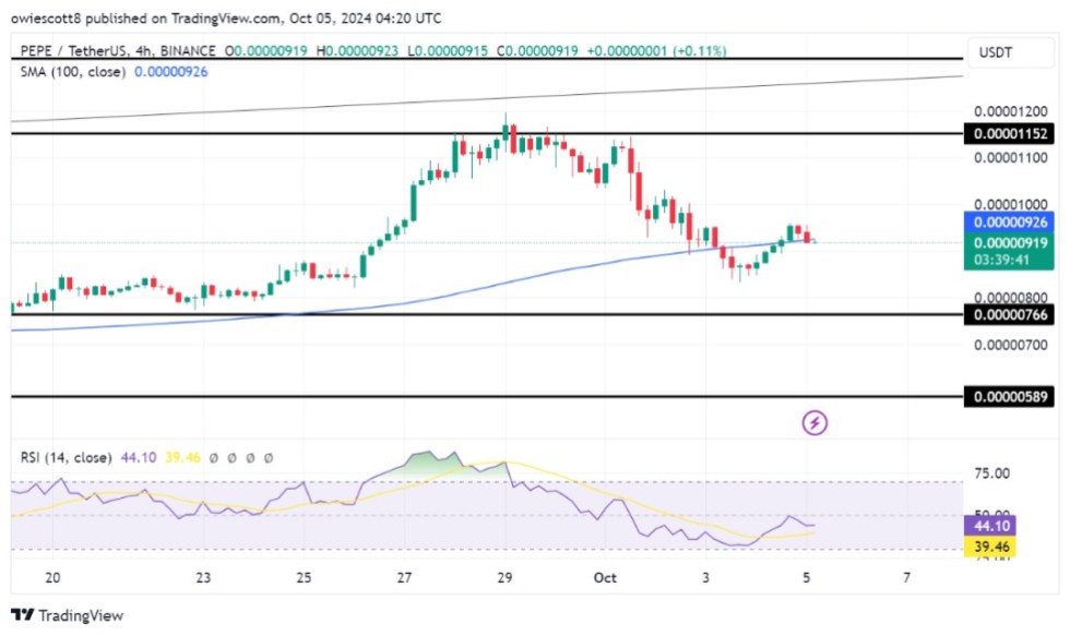 PEPE has recently entered bearish territory on the 4-hour chart, dipping just below the 100-day Simple Moving Average (SMA) and approaching the crucial $0.00000766 support level. This drop below the 100-day SMA indicates weakening strength, and with sellers taking control, the cryptocurrency faces the possibility of more losses.