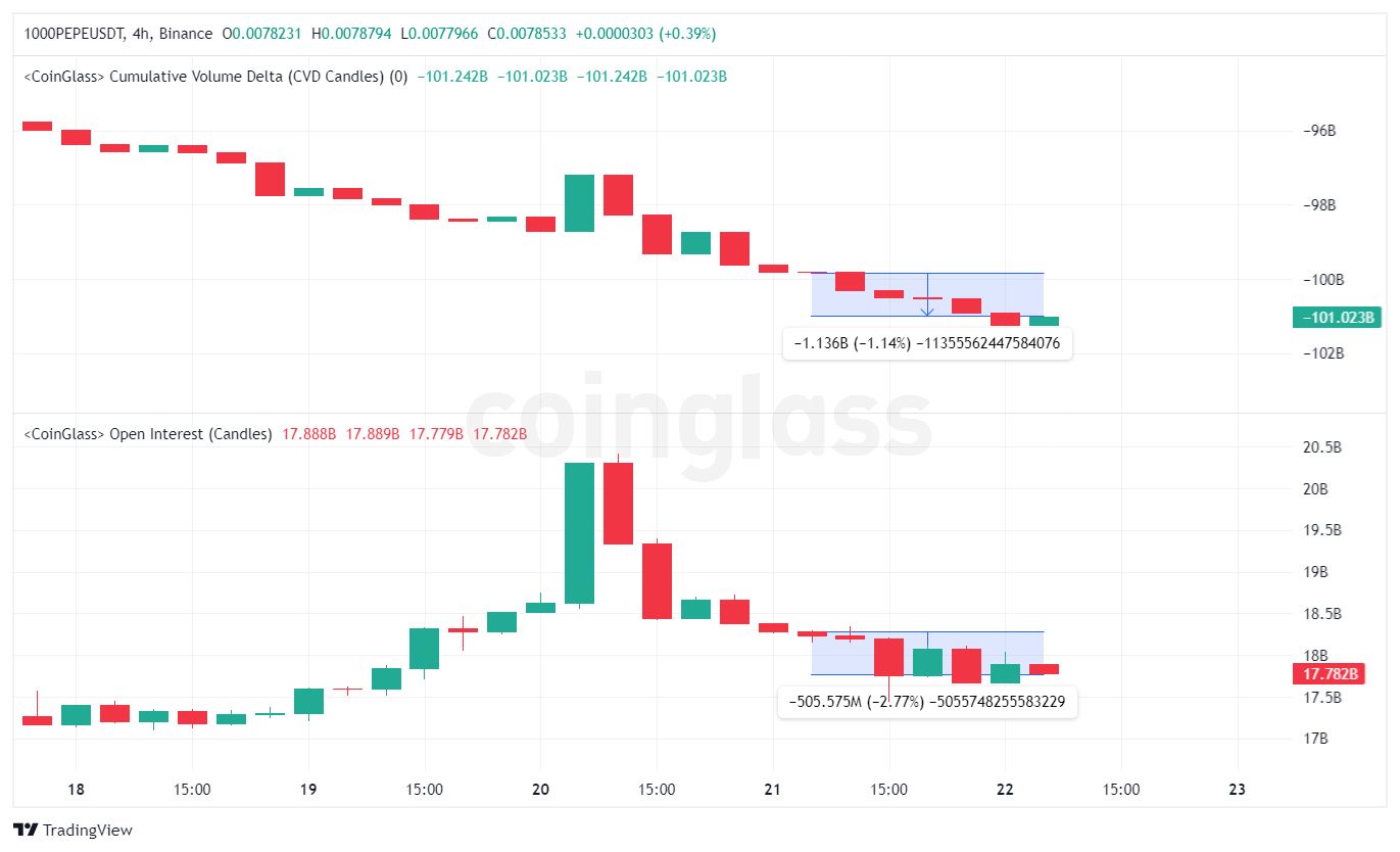 A side-by-side comparison of the OI and cumulative volume delta (CVD) shows that both are dropping. When this happens, it signifies that long positions are being closed. This means that although Shorts are closing in profit, no new Long positions are opening, which can be a bearish indicator for the PEPE.