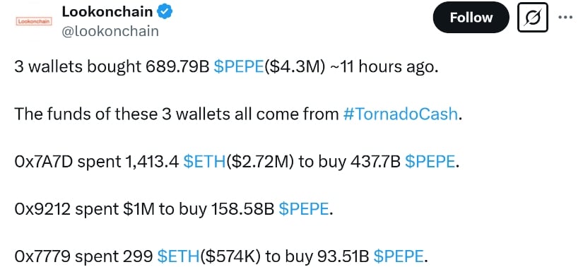 Three wallets funded via Tornado Cash bought 689.79B PEPE ($4.3M). Source: Lookonchain via X