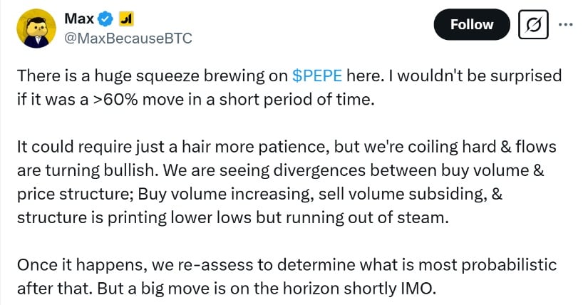 PEPE is coiling for a major breakout, with rising buy volume, weakening sell pressure, and a potential 60% surge imminent. Source: Max via X