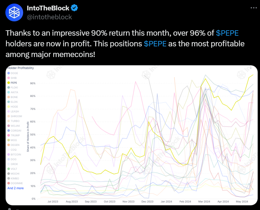 PEPE has been exceptionally profitable for its holders. According to data from IntoTheBlock, over 96% of PEPE holders are currently in profit. This remarkable statistic underscores the coin’s successful rally. Here’s a snapshot of PEPE’s profitability: