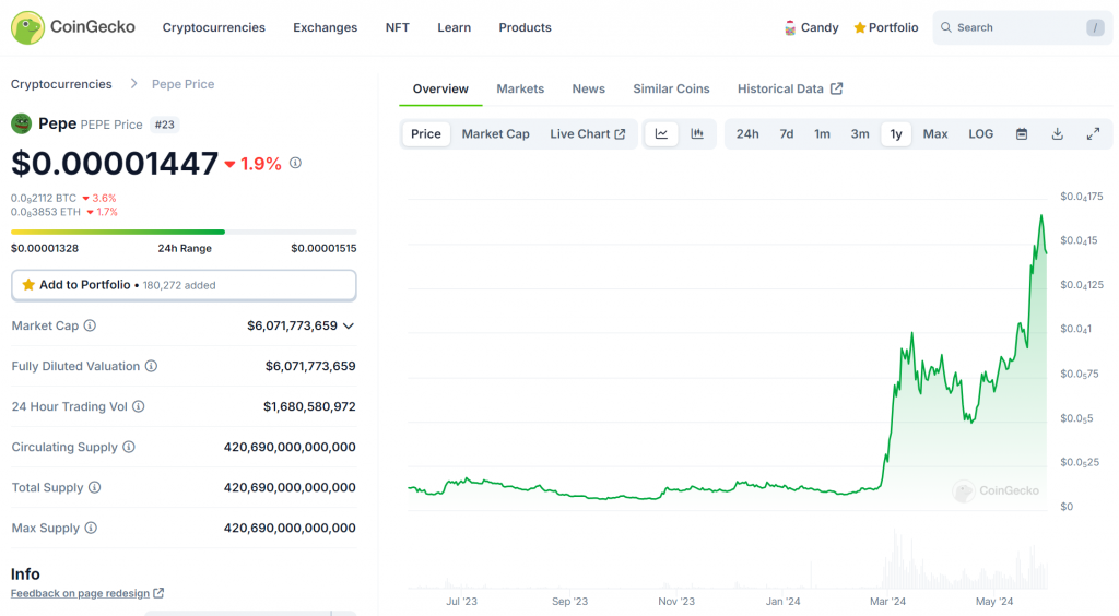 Despite its strong performance, PEPE has experienced some volatility. The coin has seen a slight drop in value recently. Here are the details: