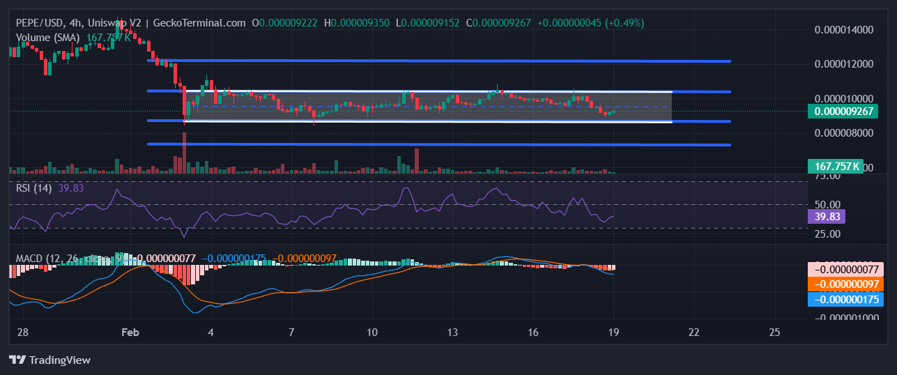 The Pepe price has been in a consolidation phase between $0.000008683 and $0.000010382 over the past few days, data from GeckoTerminal shows. This period of sideways trading might be the build up to a big move for the frog-themed meme coin.
