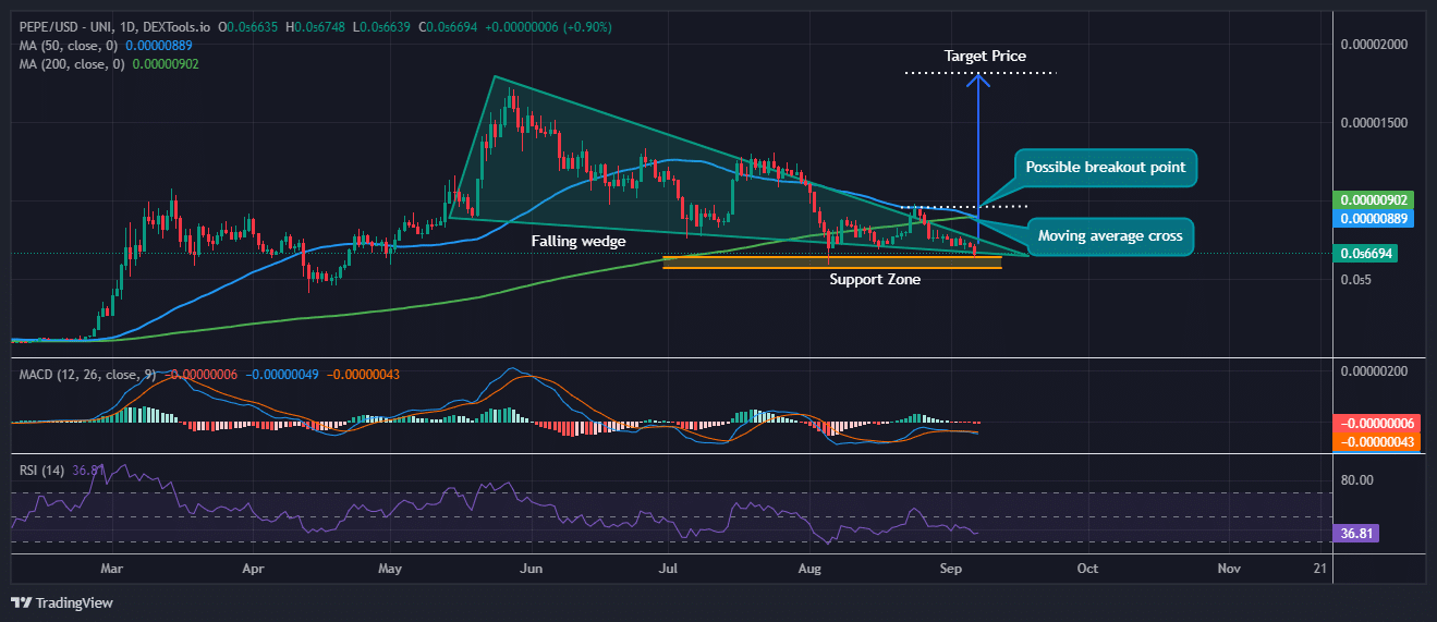 The PEPE price chart on the daily timeframe shows a clear formation of a falling wedge pattern, which is generally considered a bullish reversal pattern.