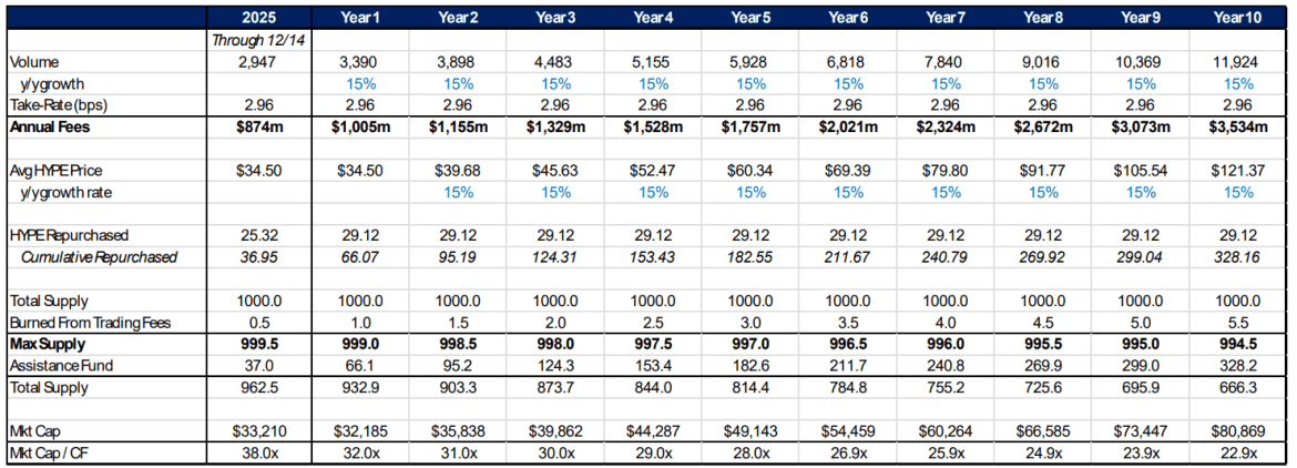 The company’s prediction assumed that the token’s price will grow at a 15% compound annual growth rate while the Assistance Fund will repurchase about 291 million HYPE tokens, reducing the total supply to 666 million tokens.