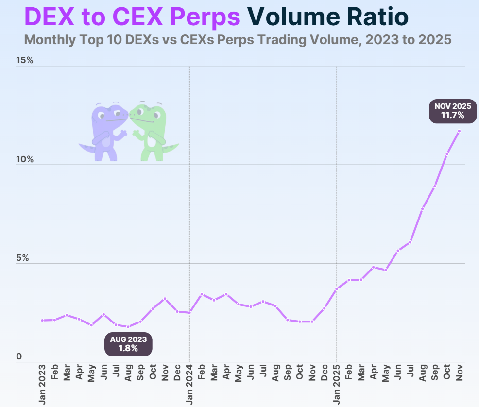 Perp DEXs have already taken a significant share of revenue from centralized exchanges, as their market share rose from 2.1% in January 2023 to a new all-time high of 11.7% in November 2025, according to a report by data aggregator CoinGecko.