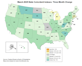 The Federal Reserve Bank of Philadelphia has released the coincident indexes for the 50 states for March 2025. Over the past three months, the indexes increased in 43 states, decreased in four states, and remained stable in three, for a three-month diffusion index of 78. Additionally, in the past month, the indexes increased in 39 states, decreased in seven states, and remained stable in four, for a one-month diffusion index of 64. For comparison purposes, the Philadelphia Fed has also developed a similar coincident index for the entire United States. The Philadelphia Fed’s U.S. index increased 0.6 percent over the past three months and 0.2 percent in March.Note: These are coincident indexes constructed from state employment data. An explanation from the Philly Fed: