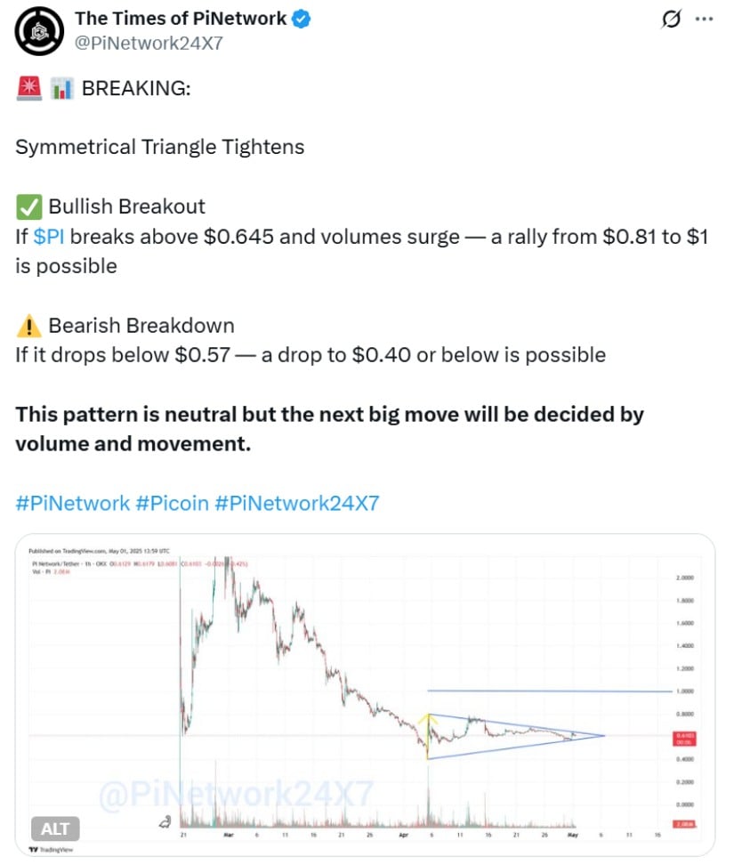 Pi Coin’s symmetrical triangle suggests a breakout is near, with volume likely to determine a bullish move above $0.645 or a bearish drop below $0.57. Source: The Times of PiNetwork via X