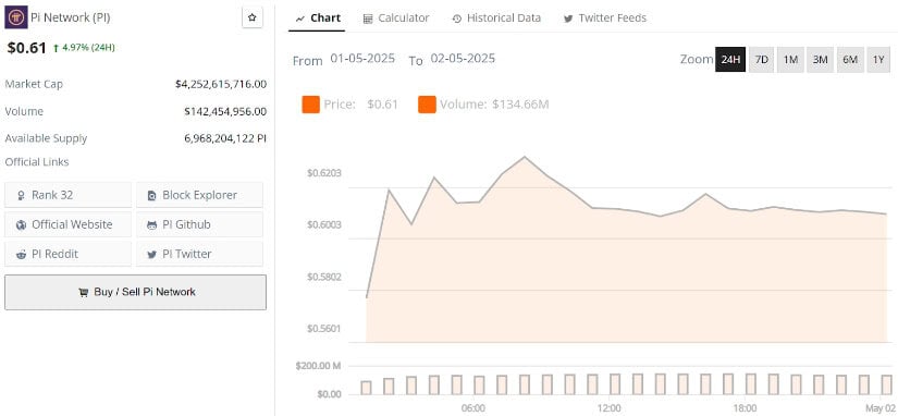 Pi Network Coin was trading at around $0.61, up 4.97% in the last 24 hours at press time. Source: Brave New Coin
