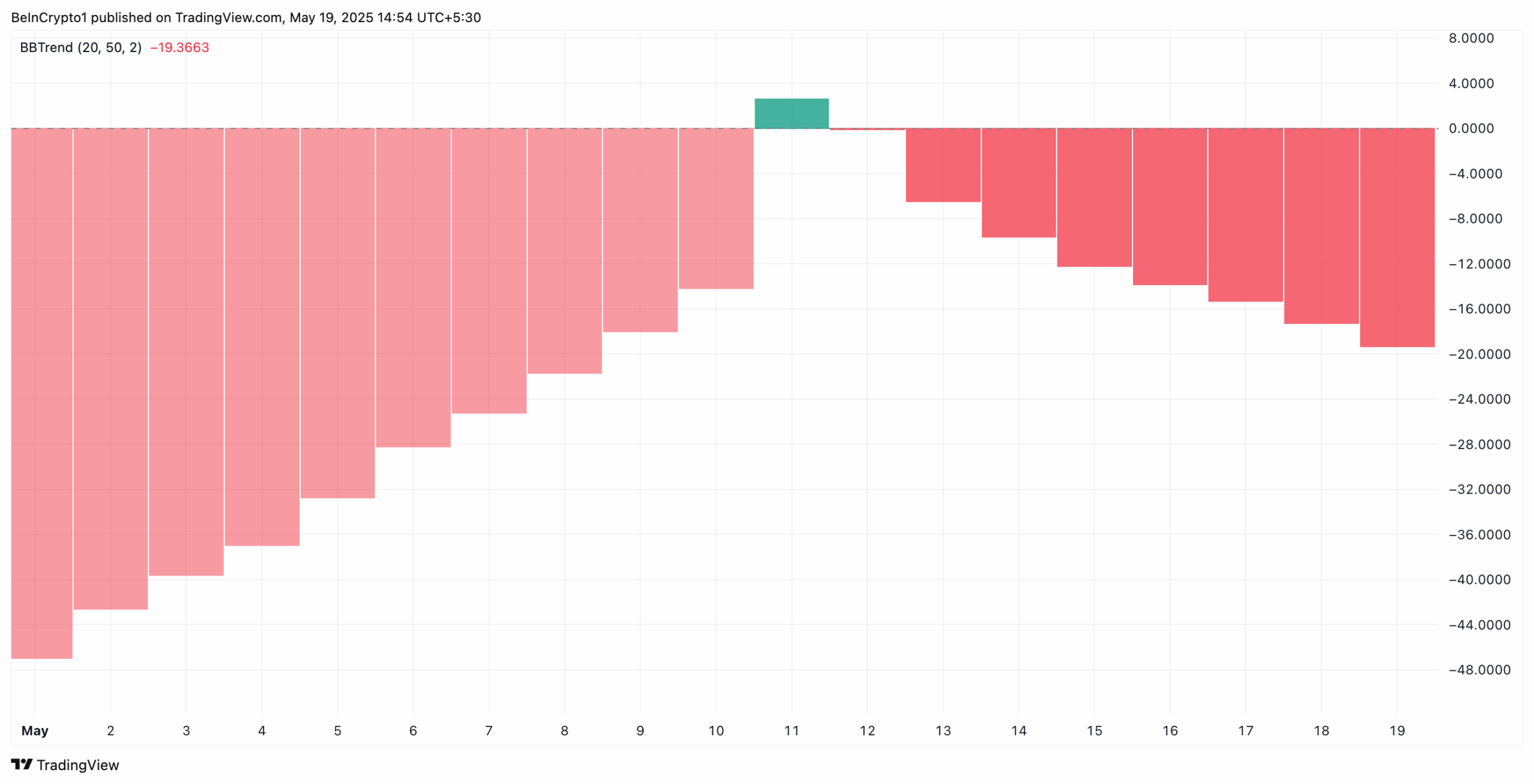 PI’s BBTrend remains in the red on the daily chart, confirming that bearish forces are firmly in control. Observed on a one-day chart, the indicator is currently at -19.36.