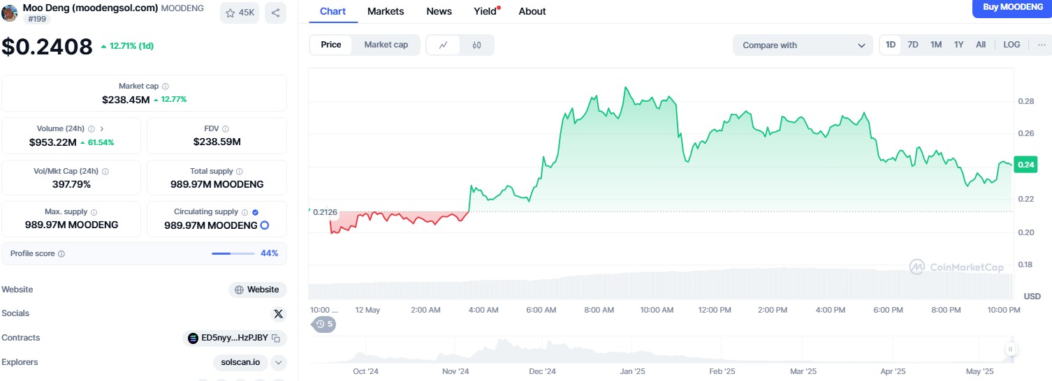 The coin’s fully diluted valuation currently stands at $238.59 million. At the time of reporting, MOODENG is trading at $0.24, reflecting intense bullish pressure.