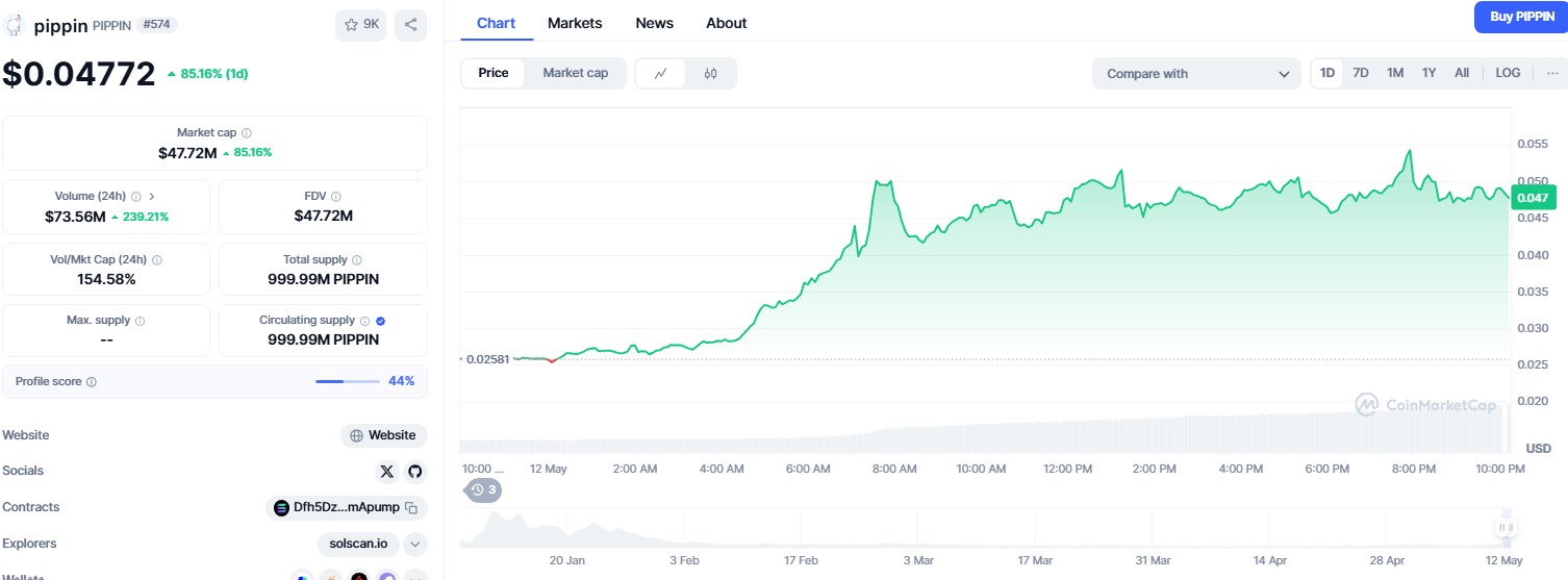 Launched in November 2024, PIPPIN has a total and maximum supply of 999.94 million tokens and a fully diluted valuation (FDV) of $47.2 million.