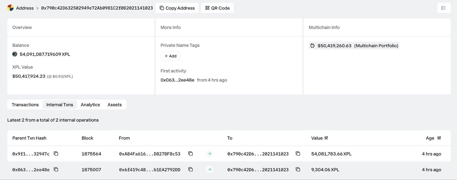 The investor received 54.09M XPL, now worth about $50.4M with the token trading between $0.93 and $1.14, an unrealized profit of $47.7M within hours of launch.