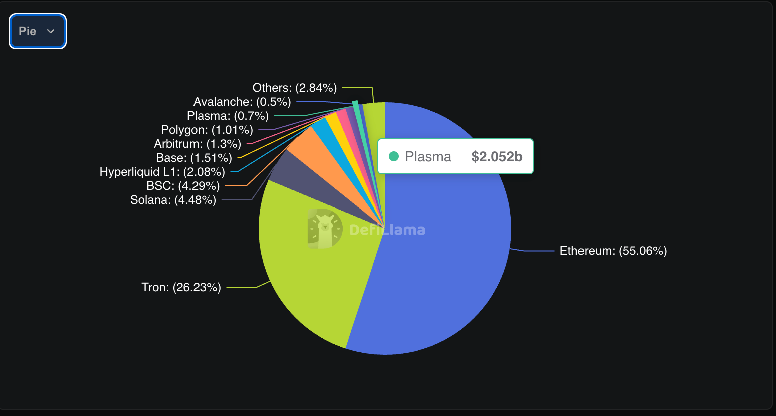 On-chain data highlights how Plasma is leaning into a “liquidity first” strategy. DefiLlama shows roughly $2.05Bn in stablecoins active on the network, while decentralized exchange activity remains light.