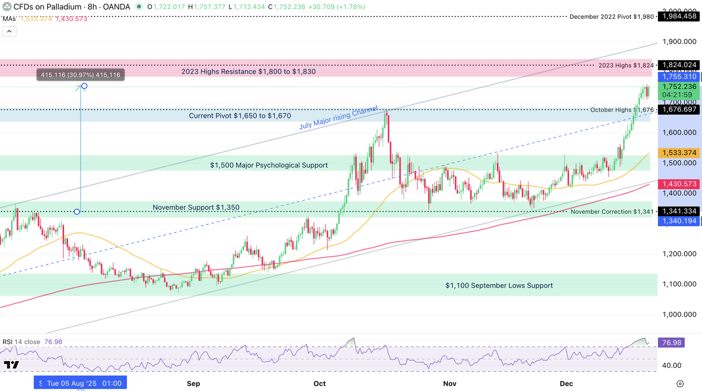 Platinum (XPT/USD) is once again leading the pack as its push toward decade highs continues, but one metal that we haven’t discussed much is Palladium (XPD/USD), which is also printing new multi-year highs.