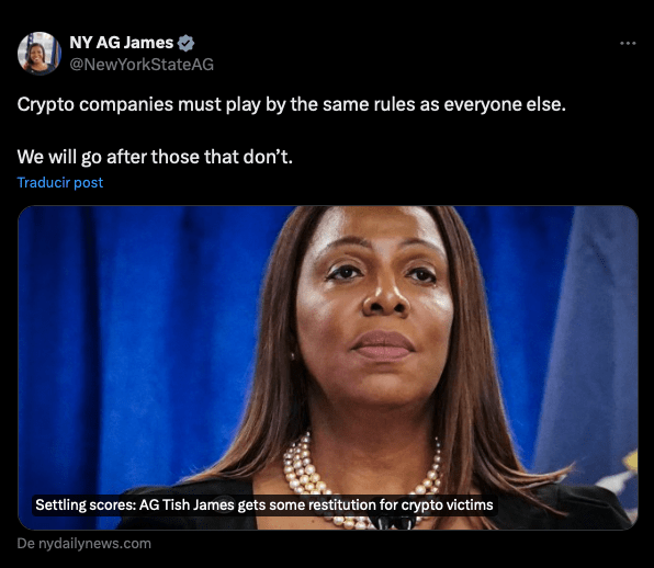 Over the weekend, James reinforced her position towards companies in the sector on an X post. The NY Attorney General issued a new warning to the sector, telling all crptocurrency companies operating in the state that they must comply like any other company.