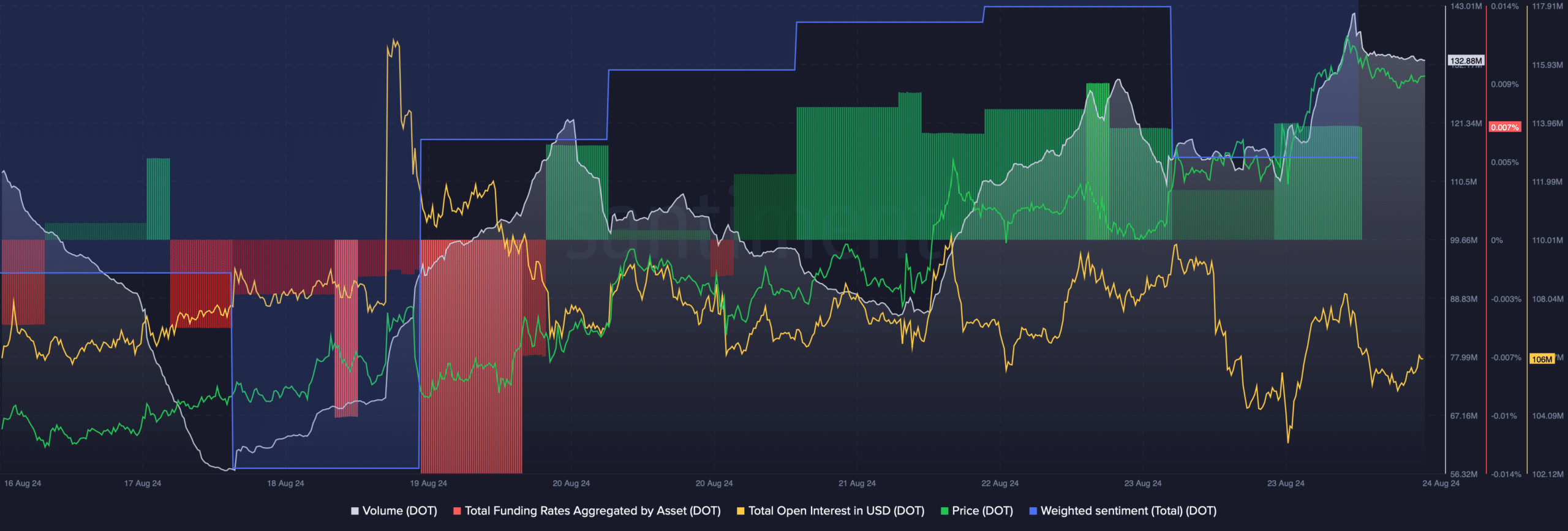 However, Polkadot’s funding rate climbed on the charts. Generally, prices tend to move in the other direction than the funding rate. Moreover, Polkadot’s Open Interest declined. Whenever the metric dips, it suggests that the chances of the prevailing price trend changing are high.