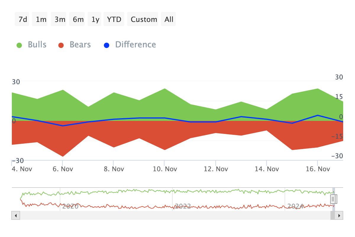 Additionally, the increase in whale accumulation aligns with growing bullish dominance, as highlighted by IntoTheBlock’s Bulls and Bears indicator. This metric tracks the activity of investors who bought (bulls) at least 1% of the total trading volume versus those who sold (bears) a similar amount.