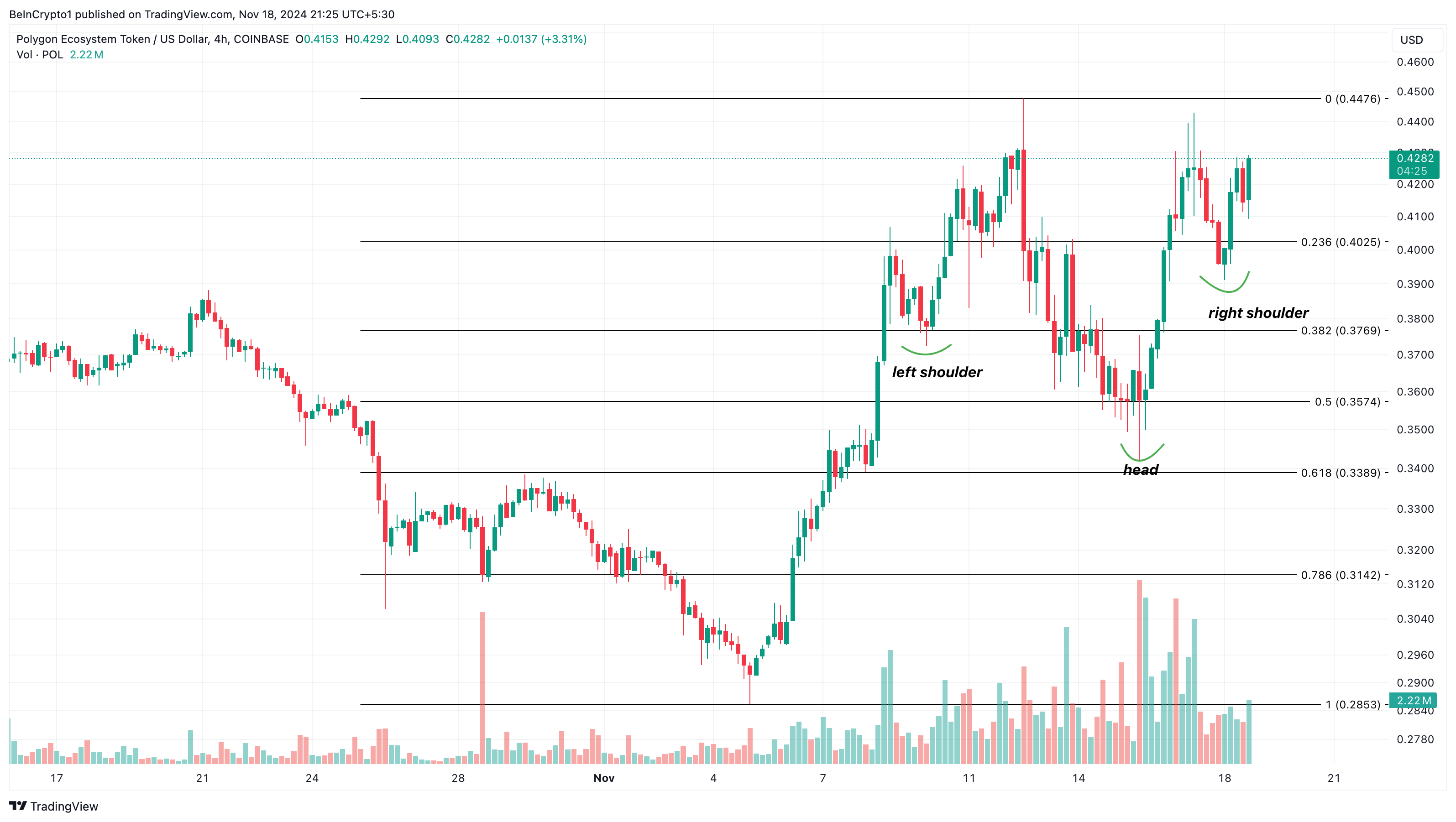 A look at the 4-hour timeframe shows that the POL/USD chart has formed an inverse head-and-shoulders pattern. An inverse head-and-shoulders pattern is a technical pattern that indicates a potential reversal from a downtrend to an uptrend.