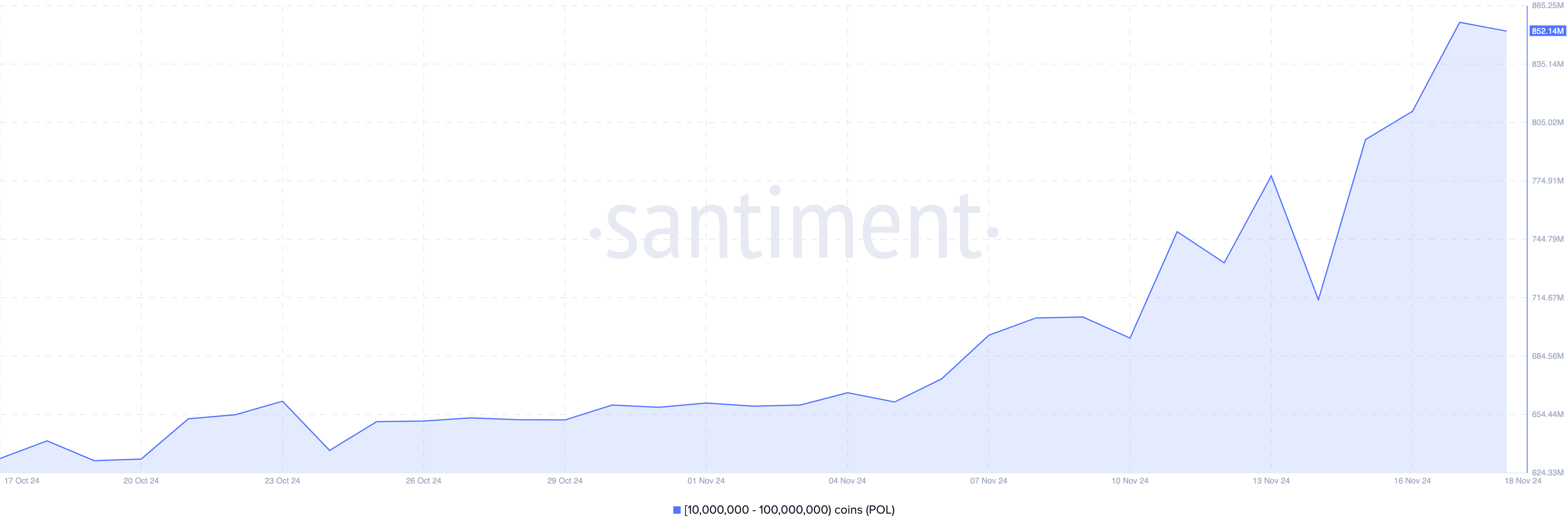 On November 11, addresses holding between 10 million and 100 million POL tokens in their wallet collectively owned 695.38 million tokens. Today, that figure has surged to 852.14 million, showing that Polygon whales have accumulated over 113 million tokens in the past seven days.
