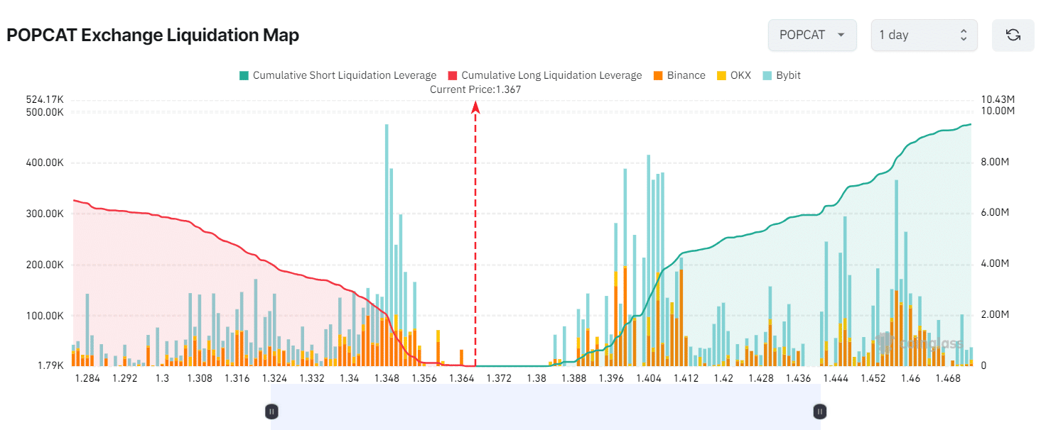 At press time, POPCAT was trading near $1.36 and has experienced a price decline of over 7.55% in the past 24 hours. During the same period, its trading volume has jumped by 40%, indicating higher participation from traders and investors potentially due to its price decline.