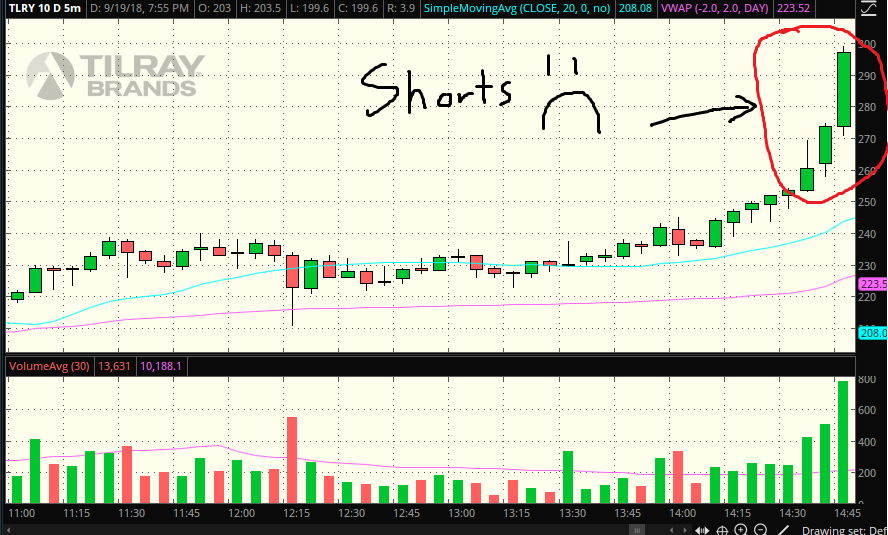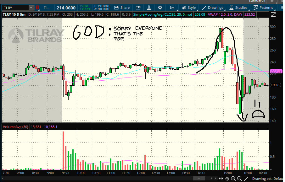 Pete (on chat): We shouldn’t short this TLRY anymore. It’s making highs past 2pm, that’s not a formula for a stock where you should short at that time period. Let it gap to $400 for the next day or something and short the open again.