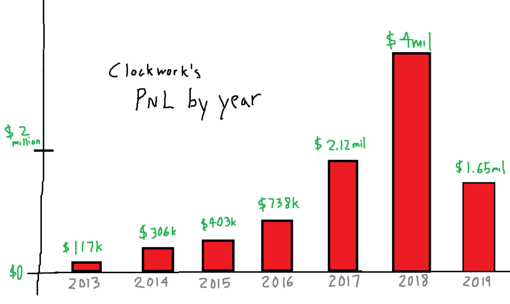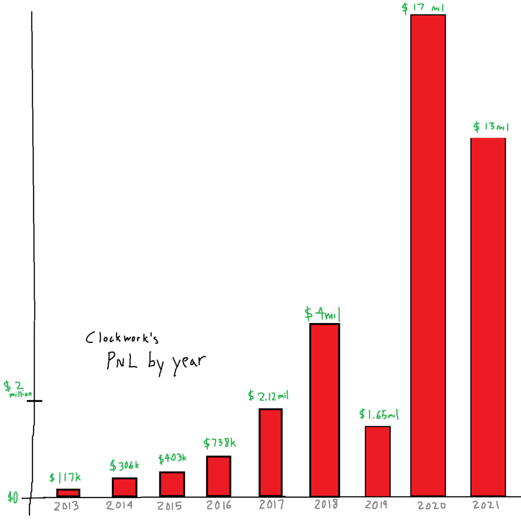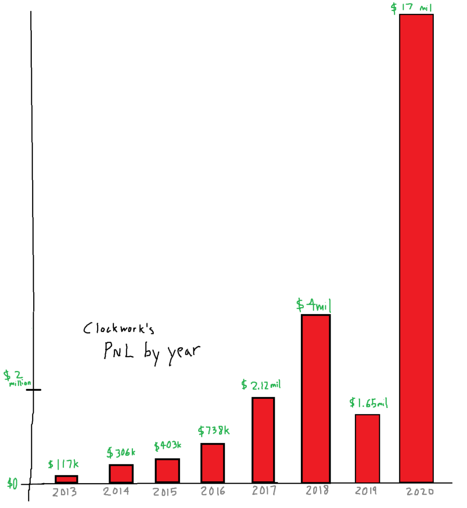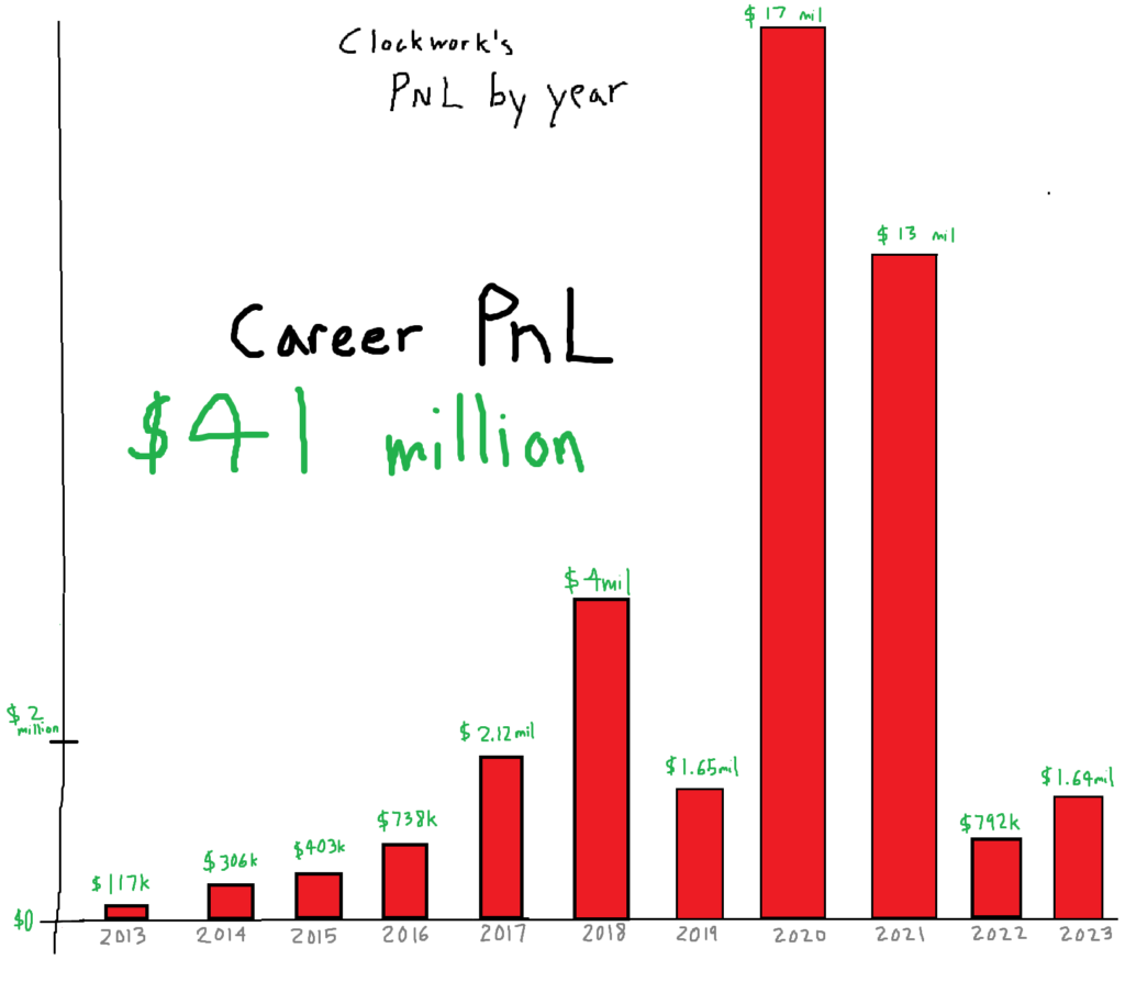 At the end of the May, Clockwork had accumulated $8 million in YTD profits, already surpassing his prior career high in 2018.