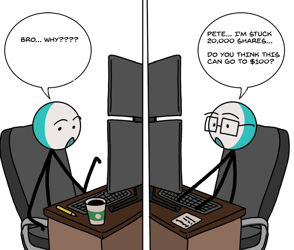 Yeah CJ has a point. He is the all-seeing floor manager who can see all the blood on this TLRY. Clockwork is currently down $60,000 on it. That’s at 60% of his daily stop limit, a threshold that he’s rarely ever at given his propensity to avoid drawdown as much as possible. He has a lot of other traders in his ear chit-chatting about the stock.