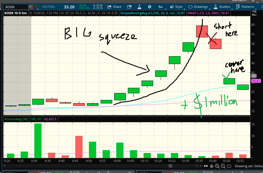 He’s been riding the entire wave of green candles and is down several hundred thousand dollars with no idea where to get out. The KODK short squeeze seems unstoppable, with traders relentlessly spamming the ask and forcing the stock higher.