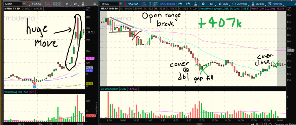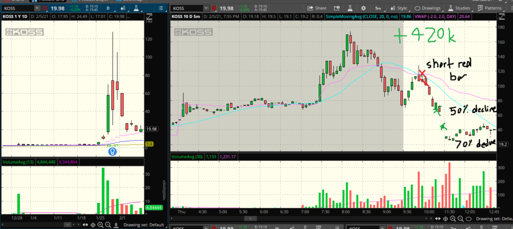 This was the beginning of the “big halt down” trade. It’s a simple formula–bunch of green candles for a 100%+ intraday move, then first red candle and halt down–you hammer it and wait for the -50% gap down.