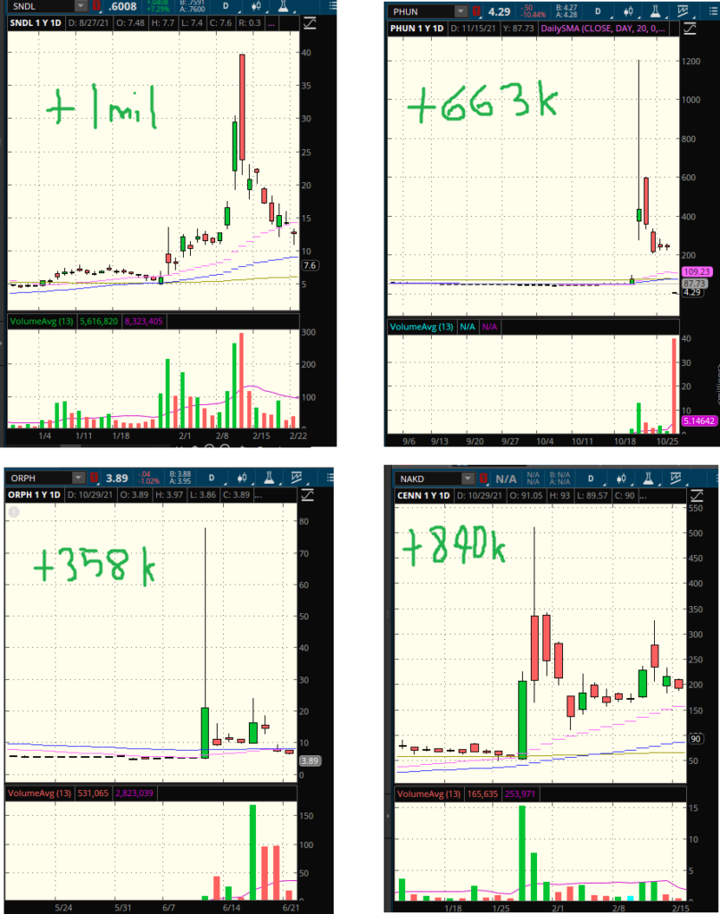 Fourth, there was the world of Pump-and-Dumpia—the realm of low-float penny plays and junk stocks. 2021 saw the meteoric rise of pump-and-dump groups on WhatsApp, Telegram, and Discord groups. People lost all shame and pumped whatever piece of shit they could. What were once-a-month opportunities in 2018 for the small cap short seller was now seemingly occuring on a daily basis.
