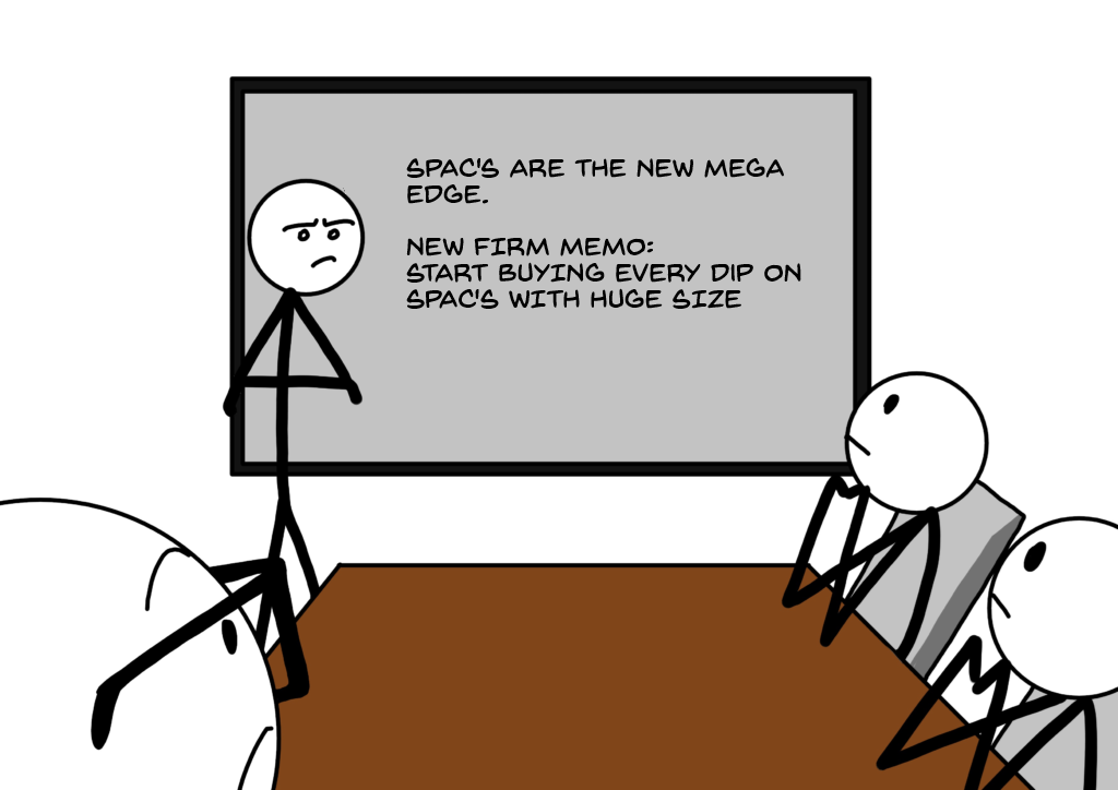 Toward the end of the year, as the market kept climbing to new highs, there was a meeting where Victor spotlighted one of the desk’s rising stars. This guy had been trading with MBC for over seven years, but his big breakthrough only came in the last couple of years. Around the desk, he’d earned the nickname ‘SPAC-Wizard.’ Unlike the day traders who were happy scalping for small percentage gains, he was a research-driven trader who zeroed in on SPACs with asymmetric opportunities. He’d hold onto them for incredible 5-10x returns. Victor was so sold on his approach that he called a meeting to have SPAC Wizard break down down his process for the entire firm. He then encouraged everyone to follow into the same strategy.