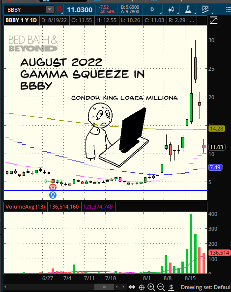 Just when we thought meme stocks were forever dead, a dying retailer called Bed, Bath, and Beyond–BBBY–starts ripping away in August. Early on, it shoots up from $5 to $10, and the Condor King, confident as ever, shorted a massive amount of out-of-the-money options. But then came the gamma squeeze, pushing the stock to $30 in just a week and turning his options book into a sea of red. Turns out his so-called ‘exotic hedging’ was just straight-up naked call selling with zero actual hedging.