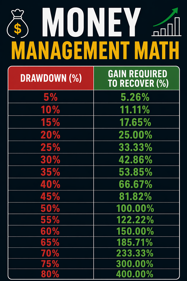 Look at the money management math. A 10% loss needs 11% to recover. Manageable. But push that to 30% and now you need nearly 43% just to get back to even. At 50%, you’re staring at a 100% climb. At 80% you need a 400% gain to get back to breakeven, That’s not trading anymore. That’s digging out of a hole. This is where most traders break, not because they lack opportunity, but because they let small, acceptable losses turn into large, compounding problems.