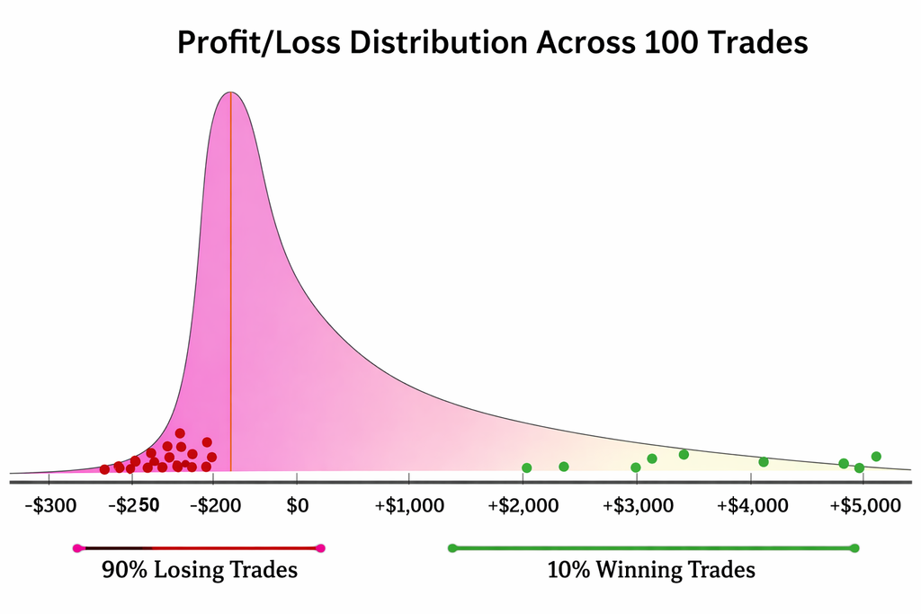 Consider a distribution of 100 trades. Ninety of them result in losses, each modest and contained between one hundred and three hundred dollars. The remaining ten trades generate gains ranging from one thousand to five thousand dollars. At first glance, the win rate appears catastrophic. But the outcome tells a very different story.