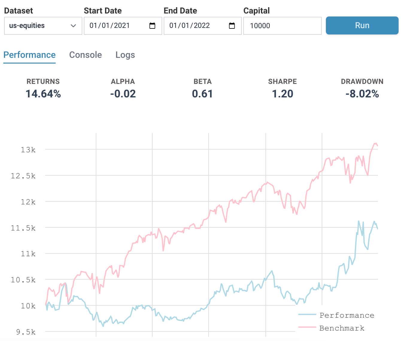 We can see that our strategy returns fell. As a comparison, the drawdown reduced from about 8% to just 4.2%.