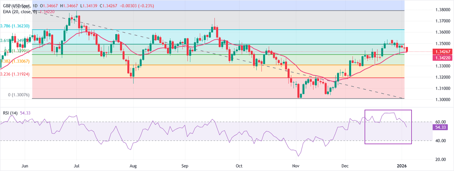 In the daily chart, GBP/USD trades at 1.3427 at the time of writing. Price holds marginally above a rising 20-day Exponential Moving Average (EMA) at 1.3422, keeping the short-term bias pointed higher. The average has advanced steadily and continues to underpin shallow pullbacks.