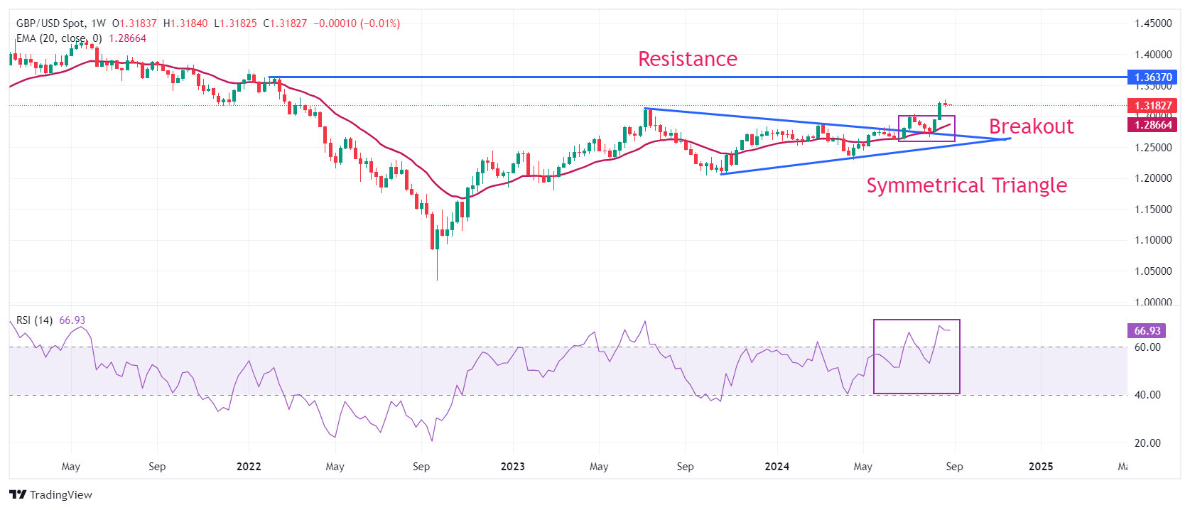 The upward-sloping 20-week Exponential Moving Average (EMA) near 1.3000 suggests a strong upside trend.