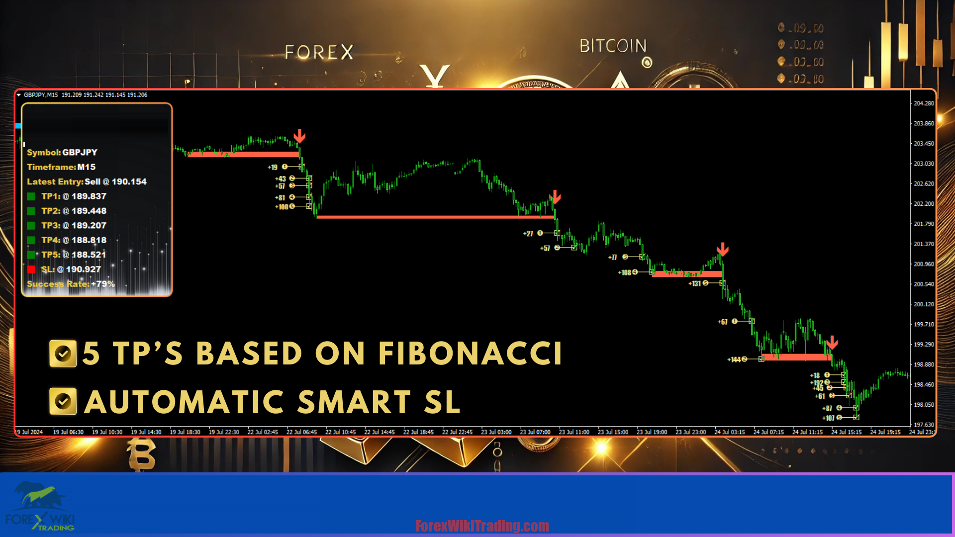 Each breakout signal comes with five take profit levels, derived from Fibonacci extensions, allowing traders to lock in gains strategically.