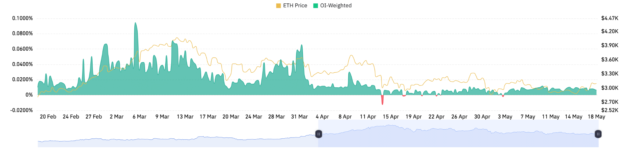 Recently, the Funding Rate has been relatively low or negative, which could imply a cooling off of bullish momentum or increased caution among traders, especially during price dips as it happened in mid-April.