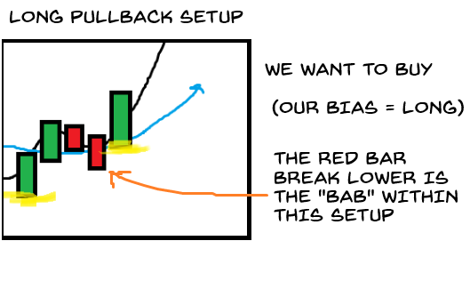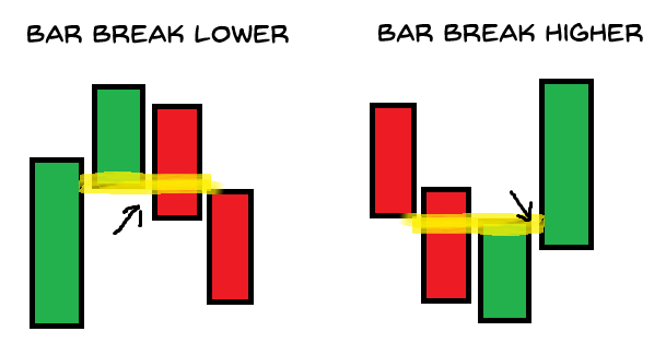 The second concept to understand is bar break against bias (BaB). If your bias is long, a bar break against your bias would be a bar break to the downside. If your bias is short, a bar break against your bias would be a bar break to the upside.