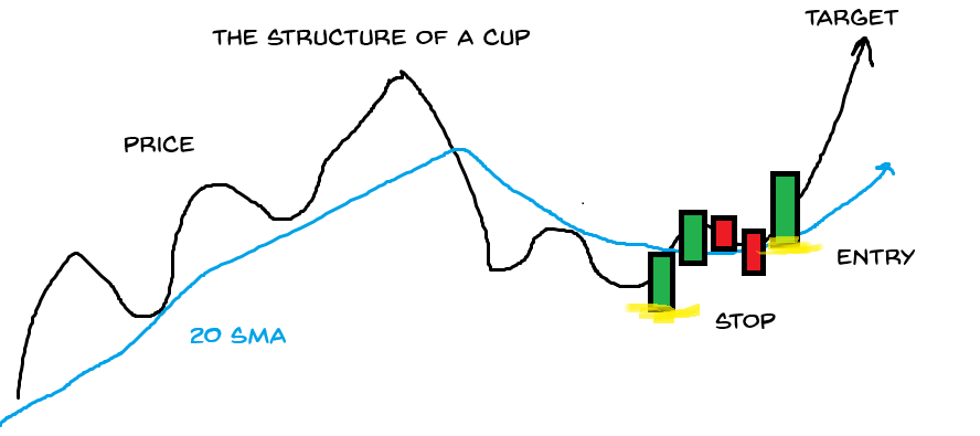 This is needed to understand the 3rd concept that combines both the 1st and 2nd concept together to create price formations that PB called cups . A cup is basically a pre-determined sequence of BBs and BaBs, in conjunction with a moving average, that creates a clearly defined price trigger with a clearly defined stop. Once this price gets above trigger, the cup is now ‘valid’ for both entry and stop. This is the Professor’s primary timing technique.
