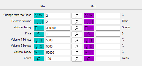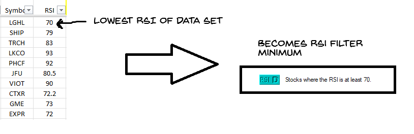 For example, take RSI, a popular indicator of whether a stock is overbought or oversold. If the lowest RSI in his dataset was 70, he would set a minimum RSI filter of 70 for his scan. Similarly, if all the stocks in the dataset traded at least 10 million shares in prior-day volume, he would set a minimum volume filter of 10 million. Stocks that fell below these thresholds—such as 9.99 million in volume or an RSI below 70—welp too bad, they’re cut off from scan.
