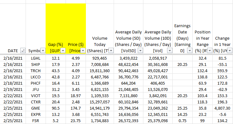 Professor Boring wants to create short biased gapper scan, so he collects 10 charts of high % gappers that closed significantly lower than their open. Then he pulls data from all of them. It might look like this.
