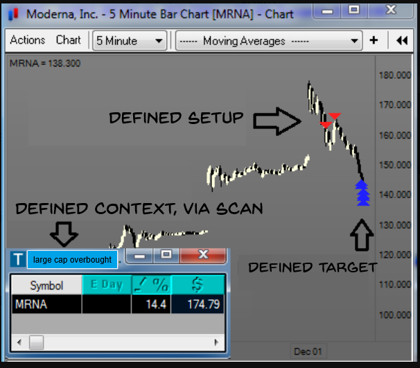 After the entry, he would also backtest which target would be hit the most frequently on average–usually they would be simple moving averages on different timeframes. If the results were sufficient, scan goes live for real trading.