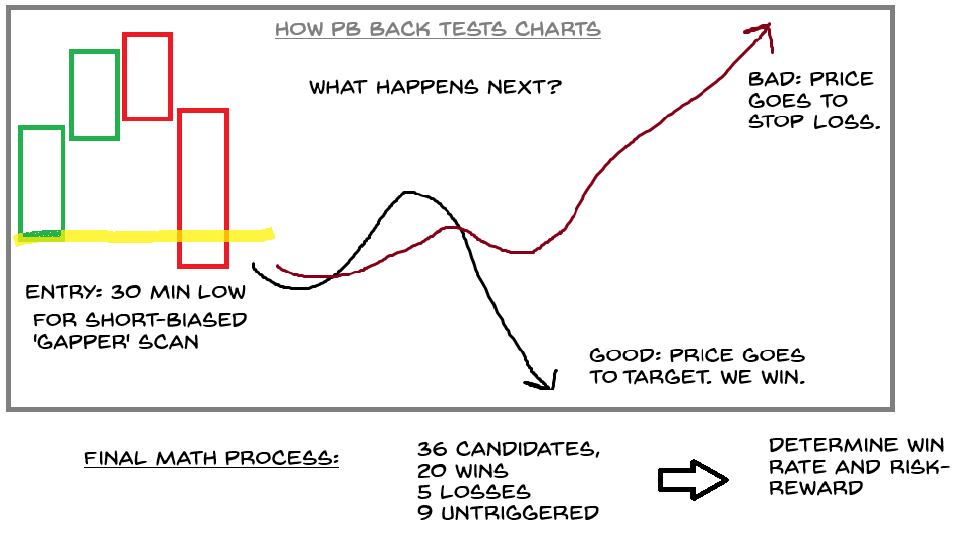 Now comes the backtesting. Have a basic entry method, a basic target and test it. So PB manually combs through every single chart via historical charting software to find every candidate that made a 30 minute low. Of those candidates, he logs the winners and the losers based on his stop/target criteria.